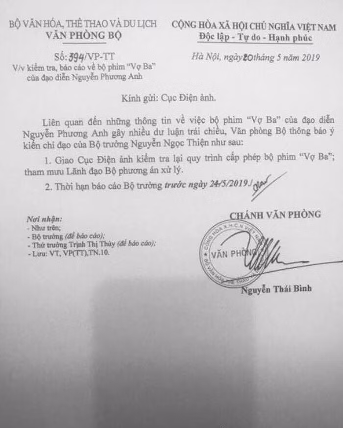 Chiều 20/5, Bộ Văn hóa, Thể thao và Du lịch vừa có văn bản yêu cầu Cục Điện ảnh kiểm tra, báo cáo về bộ phim “Vợ ba”. Bộ trưởng Nguyễn Ngọc Thiện chỉ đạo kiểm tra lại quy trình cấp phép cho bộ phim này để tham mưu Bộ đưa ra phương án xử lý trước ngày 24/5. Bộ phim đã chính thức rút khỏi các rạp từ tối 20/5.