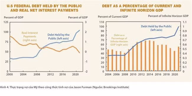 Khi GDP qua các thời kỳ không phản ánh chính xác lãi suất như số nợ, cách tính đúng hơn là lấy GDP chia cho lãi suất theo từng giai đoạn để lấy giá trị thực tại, trước khi đưa kết quả vào phân số nợ trên tổng GDP. Nếu như thế, thực chất nợ tính theo phần trăm GDP của năm 2020 vẫn thấp hơn giai đoạn 2010-2016 (hình 4, bên phải) và Mỹ đang phải trả nợ ngày càng thấp dần theo thời gian (hình 4, bên trái) vì lãi suất vay rất thấp.