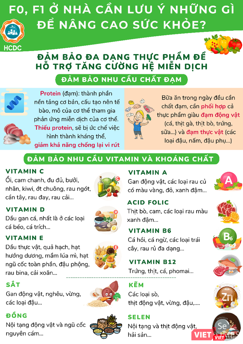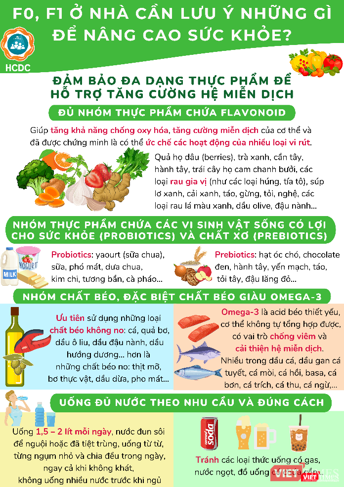 - Nhóm thực phẩm chứa Flavonoid: giúp tăng khả năng chống oxy hóa, tăng cường miễn dịch của cơ thể và đã được chứng minh là có thể ức chế các hoạt động của nhiều loại vi-rút: quả họ dâu (berries), trà xanh, cần tây, hành tây, trái cây họ cam chanh bưởi, các loại rau gia vị (như các loại húng, tía tô), súp lơ xanh, cải xanh, táo, gừng, tỏi, nghệ, các loại rau lá màu xanh, dầu olive, đậu nàng, …