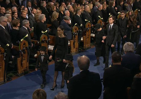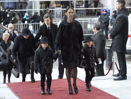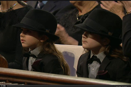 Hai người con trai sinh đôi của Celine Dion còn quá nhỏ, vì vậy, hai bé được cho ngồi ở băng ghế dành cho những người thân thích với gia đình thay vì đứng bên mẹ và các anh chị em trong lúc cử hành lễ tang.