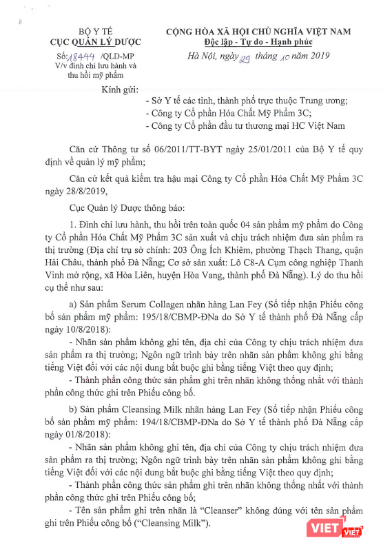 Cục Quản lý Dược đề nghị Công ty Cổ phẩn Hóa chất mỹ phẩm 3C và Công ty Cổ phần thương mại đầu tư thương mại HC Việt Nam phải gửi thông báo thu hồi tới những nơi phân phối, sử dụng các sản phẩm do Công ty đứng tên công bố, đồng thời, thu hồi toàn bộ sản phẩm mỹ phẩm không đáp ứng quy định.