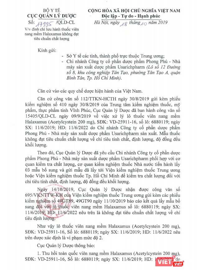 Căn cứ vào quy chế dược hiện hành và phiếu kiểm nghiệm của Trung tâm kiểm nghiệm thuốc, mỹ phẩm, thực phẩm tỉnh Vĩnh Phúc, Cục Quản lý Dược đã quyết định xử lý lô thuốc viên nang mềm Halaxamus (Acetylcystein 200 mg), SĐK: VD-25911-16, số lô: 6880119; NSX: 11/6/2019; HSD: 11/6/2022 do chi nhánh Công ty cổ phần Dược phẩm Phong Phú – Nhà máy sản xuất dược phẩm Usarichpharm sản xuất.