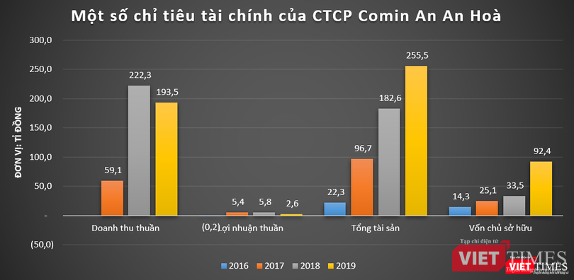 Cụ thể, năm 2017, công ty này ghi nhận doanh thu 59,1 tỉ đồng, báo lãi 5,36 tỉ đồng. Tới năm 2018, doanh thu của Comin An An Hoà tăng 3,7 lần năm trước, báo lãi 5,78 tỉ đồng. Trong năm 2019, doanh thu của công ty giảm nhẹ xuống còn 193,5 tỉ đồng, báo lãi 2,59 tỉ đồng (bằng một nửa so với năm 2018). Tính đến ngày 31/12/2019, quy mô tổng tài sản của Comin An An Hoà ở mức 255,5 tỉ đồng, cao gấp 2,7 lần vốn chủ sở hữu.