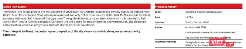 Đặc điểm của khuôn viên Green Park Estate mà VNL đề cập có nhiều điểm tương đồng với lô đất tại địa chỉ số 2 Trường Chinh, Phường Tây Thạnh, Quận Tân Phú, Tp. Hồ Chí Minh của Công ty cổ phần dệt may Thắng Lợi (Thang Loi Textile Garment Joint Stock Company – Vigatexco).