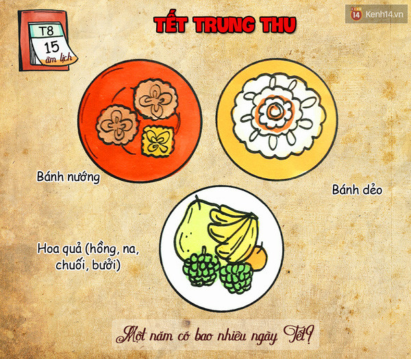 Theo phong tục người Việt, Tết Trung Thu được tổ chức vào giữa mùa thu - Rằm tháng Tám. Trong dịp này người ta làm cỗ cúng gia tiên và bày bánh trái ra sân cúng Mặt trăng.