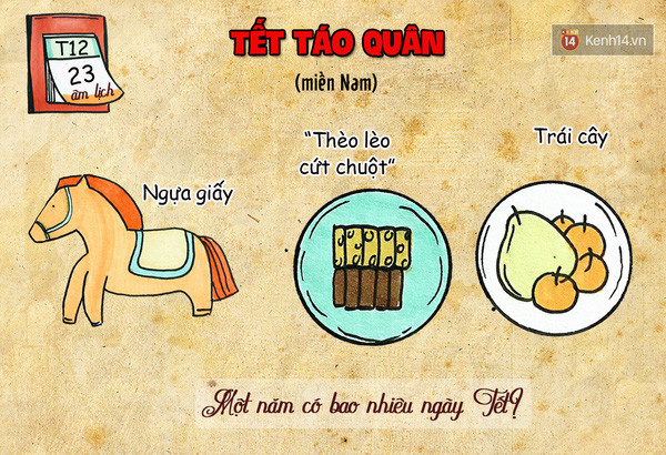 Tết Táo Quân của người miền Nam giản dị hơn người miền Bắc, chỉ cần một đĩa "thèo lèo cứt chuột", một bộ "cò bay, ngựa chạy", bình bông, nhang đèn hay đĩa trái cây là đủ rồi.