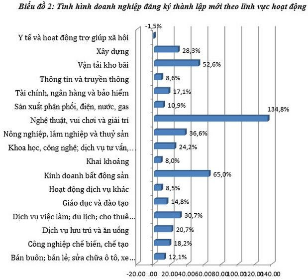 Lĩnh vực nghệ thuật, vui chơi và giải trí tăng 134,8%; Kinh doanh bất động sản tăng 65%; Vận tải kho bãi tăng 52,6%; Nông nghiệp, lâm nghiệp và thủy sản tăng 36,6%...