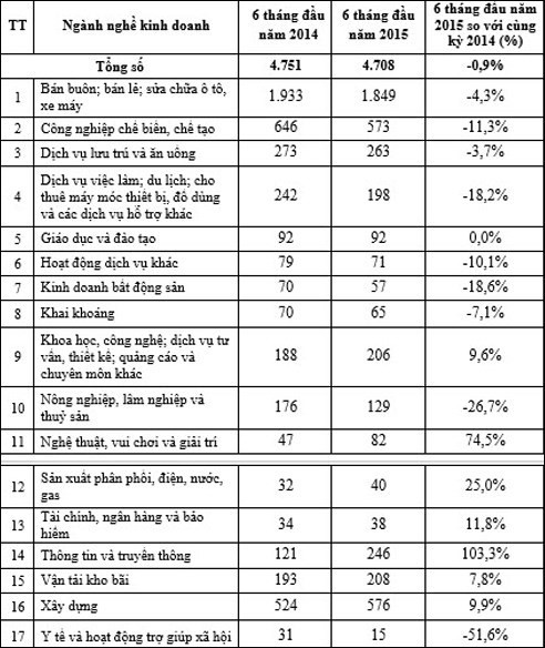 Theo Tổng cục Thống kê (Bộ Kế hoạch và Đầu tư), trong 6 tháng đầu năm nay, số doanh nghiệp hoàn tất thủ tục giải thể, chấm dứt hoạt động sản xuất, kinh doanh trong 6 tháng đầu năm là 4.708 doanh nghiệp, giảm 0,9% so với cùng kỳ năm 2014.
