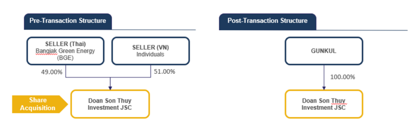 Theo đó, thương vụ được này bao gồm việc mua lại 49% cổ phần từ Bangjak Green Energy Company Limited – công ty con của BS Industry Service Co (có trụ sở tại Bangkok) và 51% cổ phần từ hai cổ đông cá nhân là bà Trần Thị Hương Hà (46%) và bà Phan Thị Bích Nga (5%).