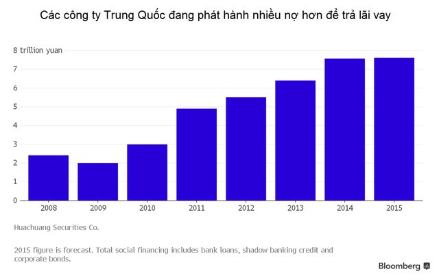 Theo số liệu từ công ty chứng khoán Hua Chuang có trụ sở ở Bắc Kinh, tổng số nợ (gồm các khoản vay ngân hàng, phát hành trái phiếu và cả tín dụng đen) được các công ty Trung Quốc sắp xếp để chi trả lãi vay có thể tăng thêm 5% trong năm nay, lên mức cao kỷ lục 7.600 tỷ nhân dân tệ (tương đương 1.200 tỷ USD). Hua Chuang là công ty nổi trội nhất về mảng phân tích các tài sản mang lại thu nhập cố định, được tạp chí New Fortune của Trung Quốc đánh giá là một trong những công ty hàng đầu về mảng này trong 2 năm 2012 và 2013.