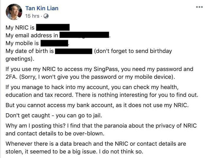 Tan Kin Lian, cựu ứng viên tổng thống Singapore luôn tin rằng mọi người đang thổi phồng vấn đề bảo mật thông tin cá nhân. Chính vì thế, ông đã đăng lên Facebook số NRIC (thẻ căn cước công dân Singapore), email, điện thoại và ngày sinh của mình hôm 27/5 (hiện đã bị xóa) với lời giải thích: