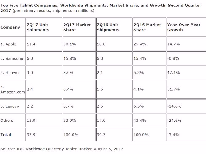 Trong Q2/2107, thị trường máy tính bảng toàn cầu ghi nhận mức doanh số 37,9 triệu máy. Sự suy giảm xuất hiện ngay cả với các mẫu máy tính bảng có thể tháo rời hay máy tính lai. IDC nhận định, khách hàng ít có nhu cầu thay thế máy tính bảng như smartphone. Do đó bất cứ sự tăng trưởng nào chỉ là một điểm nhấn hiếm hoi trong bức tranh tổng thể.