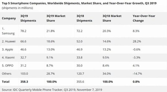 Trong danh sách 5 nhà sản xuất điện thoại hàng đầu quý III, Samsung tiếp tục giữ vững ngôi đầu với 78,2 triệu lô hàng, chiếm 21,8% thị phần và tăng trưởng 8,3% so với cùng kỳ năm 2018.
