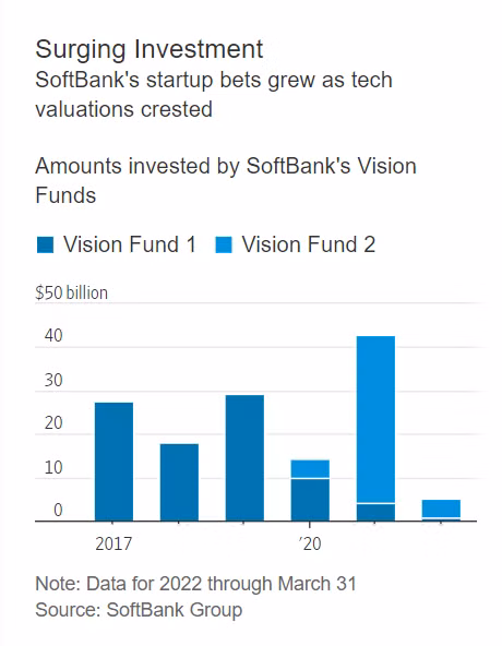 SoftBank ngày càng dựa dẫm nhiều hơn vào bộ đôi quỹ đầu tư khởi nghiệp của họ, Vision Fund 1 và 2. Kết hợp lại, giá trị vốn hoá được giao dịch công khai của hai quỹ này đã giảm khoảng 9 tỉ USD kể từ sau khi bản báo cáo về doanh thu mới nhất của SoftBank được công bố.