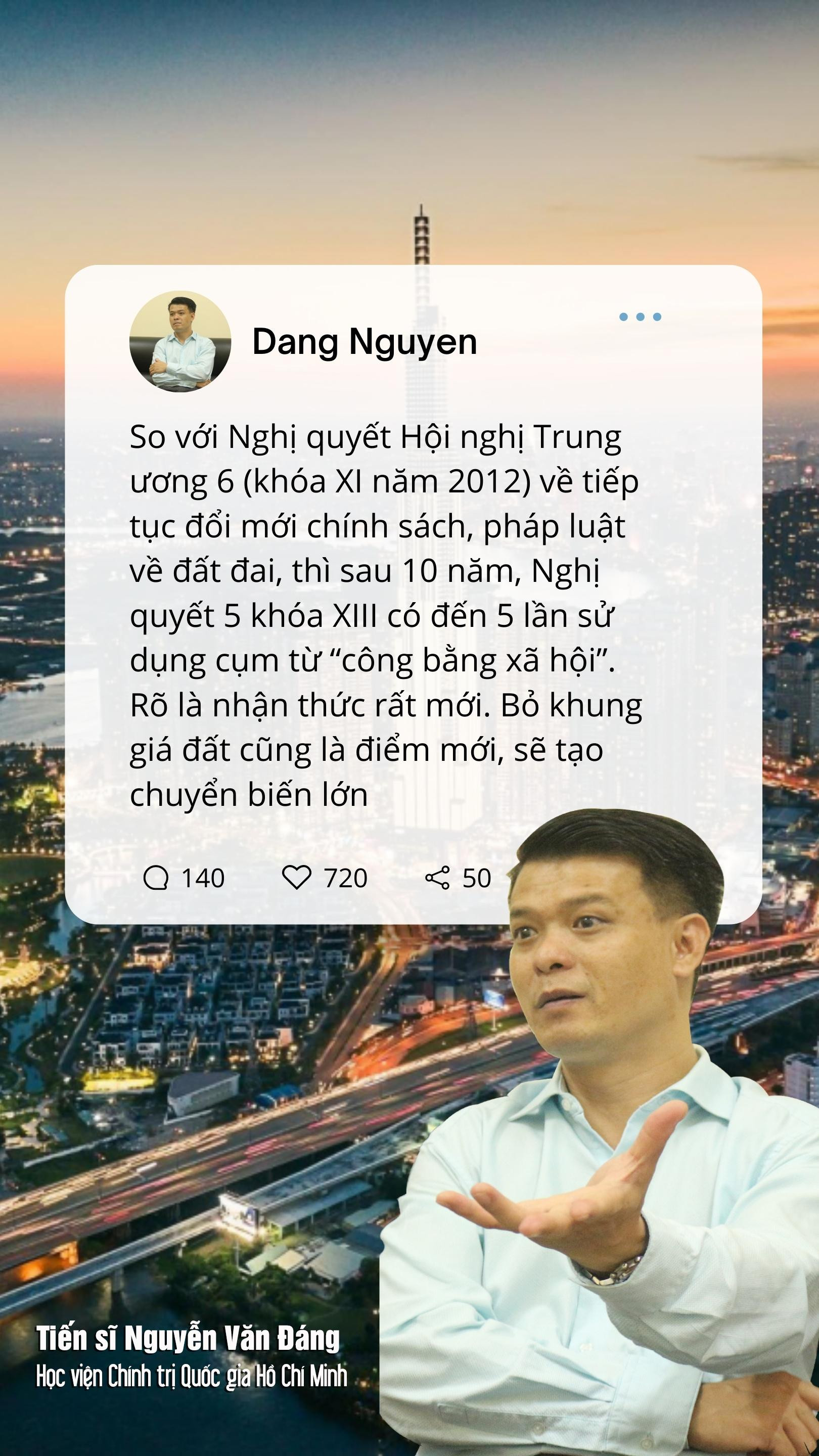 “So với Nghị quyết Hội nghị Trung ương 6 (khóa XI năm 2012) về tiếp tục đổi mới chính sách, pháp luật về đất đai, thì sau 10 năm, Nghị quyết Hội nghị Trung ương 5 khóa XIII này có đến 05 lần sử dụng cụm từ "công bằng xã hội". Rõ là nhận thức rất mới. Bỏ khung giá đất cũng là điểm mới, sẽ tạo chuyển biến lớn”, TS. Nguyễn Văn Đáng, nhà nghiên cứu Quản trị công và Chính sách, đã viết như vậy trên trang cá nhân ngay sau khi Trung ương ban hành Nghị quyết 18-NQ/TW về “Tiếp tục đổi mới, hoàn thiện thể chế, chính sách, nâng cao hiệu lực, hiệu quả quản lý và sử dụng đất, tạo động lực đưa nước ta trở thành nước phát triển có thu nhập cao” (viết tắt: Nghị quyết 18).