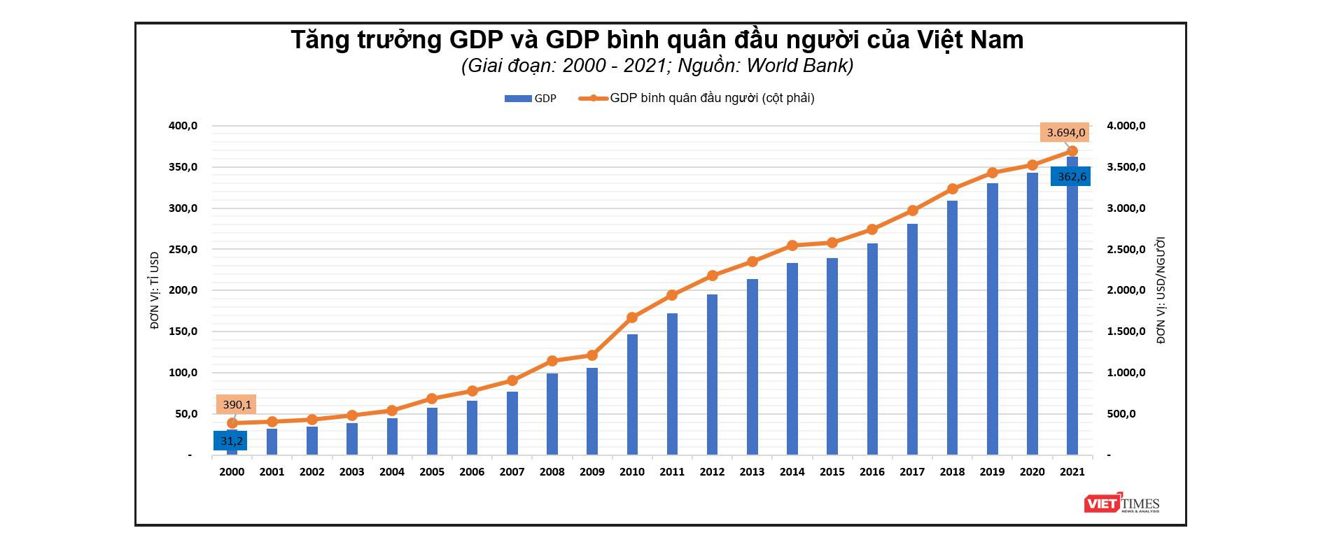Thu nhập bình quân đầu người Việt Nam cũng được cải thiện mạnh từ mức 2.178 USD/người của 2012 lên mức 3.694 USD/người của năm 2021.