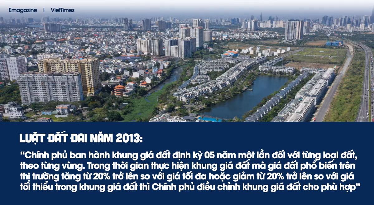 Luật Đất đai năm 2013 cụ thể hơn nhưng vẫn bám theo nguyên tắc trên: “Chính phủ ban hành khung giá đất định kỳ 05 năm một lần đối với từng loại đất, theo từng vùng. Trong thời gian thực hiện khung giá đất mà giá đất phổ biến trên thị trường tăng từ 20% trở lên so với giá tối đa hoặc giảm từ 20% trở lên so với giá tối thiểu trong khung giá đất thì Chính phủ điều chỉnh khung giá đất cho phù hợp”; “Căn cứ nguyên tắc, phương pháp định giá đất và khung giá đất, UBND cấp tỉnh xây dựng và trình HĐND cùng cấp thông qua bảng giá đất trước khi ban hành...” (Bổ sung quy định điều chỉnh khung giá đất).