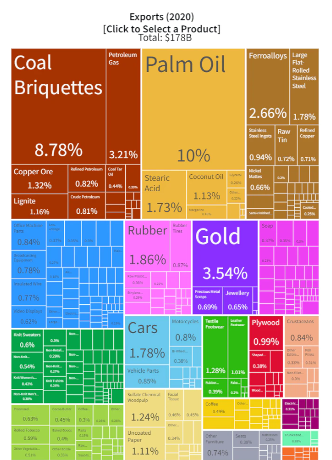 Khi nhìn vào Indonesia, quốc gia này giống như một nước xuất khẩu tài nguyên thiên nhiên. Các mặt hàng xuất khẩu hàng đầu của họ liên quan tới khai thác gỗ hay khai khoáng.