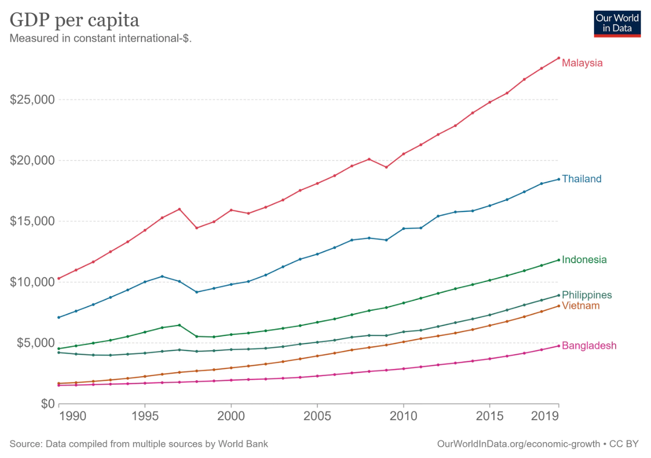 Đà tăng trưởng của Indonesia luôn vững vàng, chứ không quá thú vị. Đem so sánh với các nước láng giềng Đông Nam Á, Indonesia chỉ đứng ở tầm trung xét cả về đà tăng trưởng – mức tăng 160% kể từ năm 1990 – và về GDP đầu người. Với mức GDP bình quân 11.000 USD/người (tính theo PPP), Indonesia vẫn luôn đứng vững ở danh sách các nước có thu nhập trung bình.