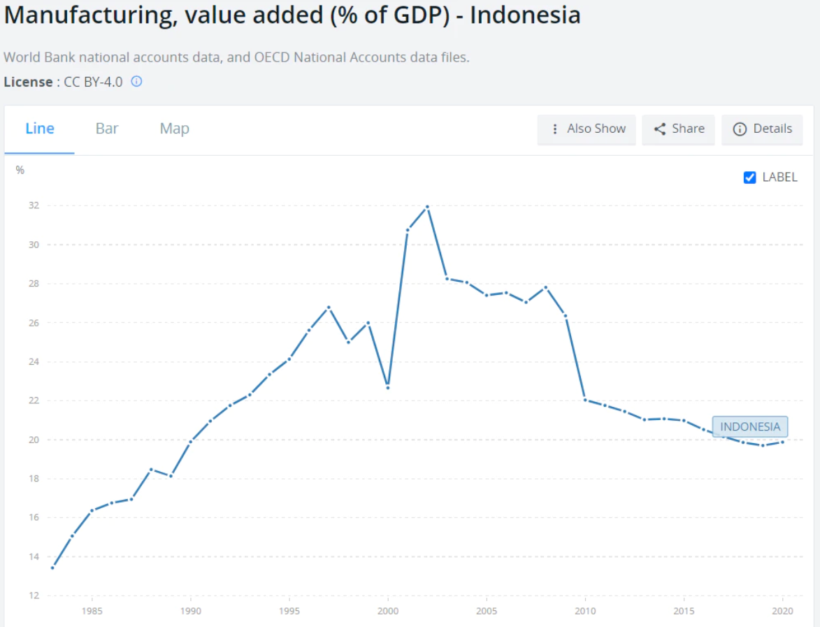 Bởi vậy, trong suốt 2 thập kỷ qua, Indonesia dường như đã trải qua một quá trình giảm công nghiệp hóa. Và khi chúng ta nhìn vào tỷ lệ đóng góp của lĩnh vực sản xuất cho GDP, điều này được xác nhận.