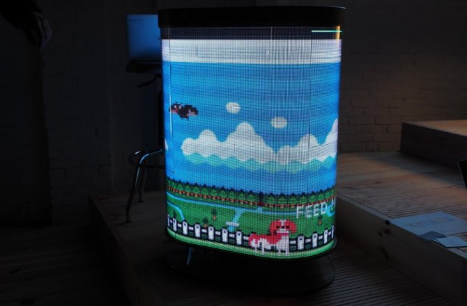 Theo Engadget, TetraBIN được bao bọc ba mặt bởi các tấm màn hình LED cỡ lớn. Màn hình hiển thị một cánh đồng xanh luôn chuyển động xoay quanh. Trên không trung là những chú dơi và ở dưới là những chú chó ở dưới mặt đất gào khóc kêu "Feed me", tức là "Hãy cho tôi ăn".