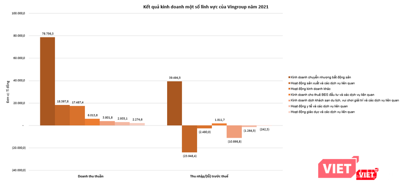 Xét theo bộ phận, trong năm 2021, hoạt động kinh doanh chuyển nhượng bất động sản của VIC ghi nhận doanh thu thuần 78.756,3 tỉ đồng, cùng khoản thu nhập trước thuế 39.494,5 tỉ đồng. Tiếp đến là hoạt động sản xuất và các dịch vụ liên quan với 18.397,8 tỉ đồng doanh thu thuần, và khoản thu nhập trước thuế đạt âm 23.948,4 tỉ đồng.