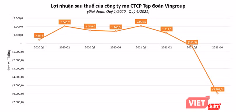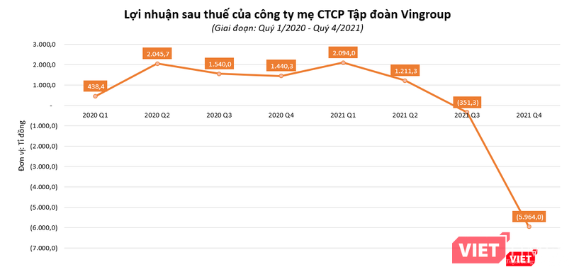 CTCP Tập đoàn Vingroup (Vingroup - Mã CK: VIC) vừa công bố kết quả kinh doanh hợp nhất quý 4/2021 với lợi nhuận sau thuế đạt âm 7.522,5 tỉ đồng (cùng kỳ năm trước báo lãi 4.545,5 tỉ đồng). Trong đó, lợi nhuận sau thuế của công ty mẹ đạt âm 5.964 tỉ đồng.