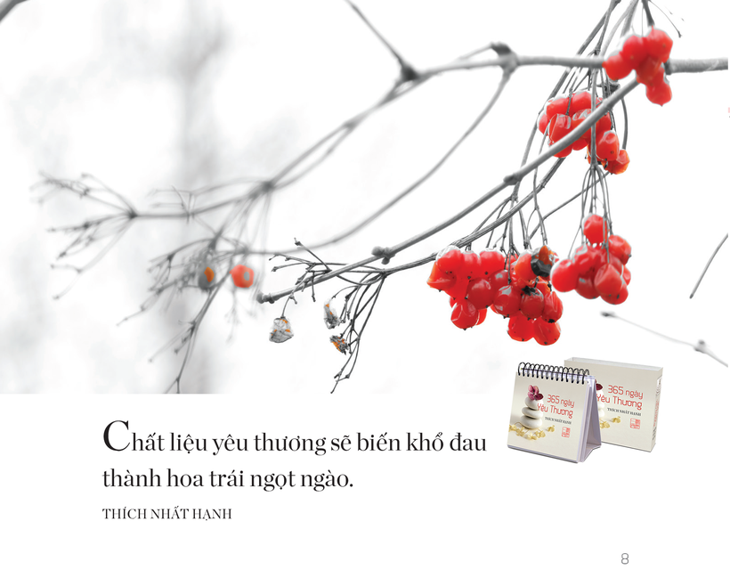 Bộ sách để bàn 365 ngày với hai chủ đề: An lạc và Yêu thương của thiền sư Thích Nhất Hạnh gửi gắm mong muốn rằng từng trang sách sẽ như một dòng suối lành rửa trôi những khổ đau, vướng mắc, để lại sự bình an trong tâm hồn mỗi người.