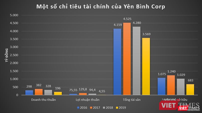 Nhưng năm 2019, doanh thu thuần và lợi nhuận thuần của Yên Bình Corp chỉ đạt lần lượt 196 tỉ đồng và 4,55 tỉ đồng, tương ứng giảm 40% và 95% so với năm 2018.