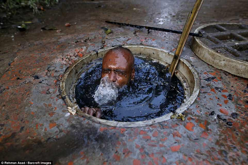 Những người dọn vệ sinh cống rãnh được trả từ 4,5 đến 7,5 bảng (120 nghìn đến 200 nghìn đồng) một ngày để bơi qua các cống rãnh bị ô nhiễm vì dân số quá đông ở thủ đô Dhaka, Bangladesh. Họ dọn rác bằng đôi tay trần hoặc một que gậy mà không có bất cứ đồ bảo hộ nào, dù là một chiếc kính bảo hộ.