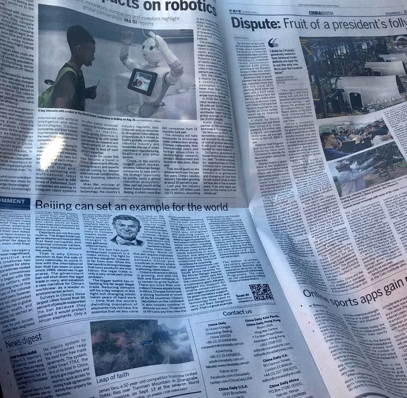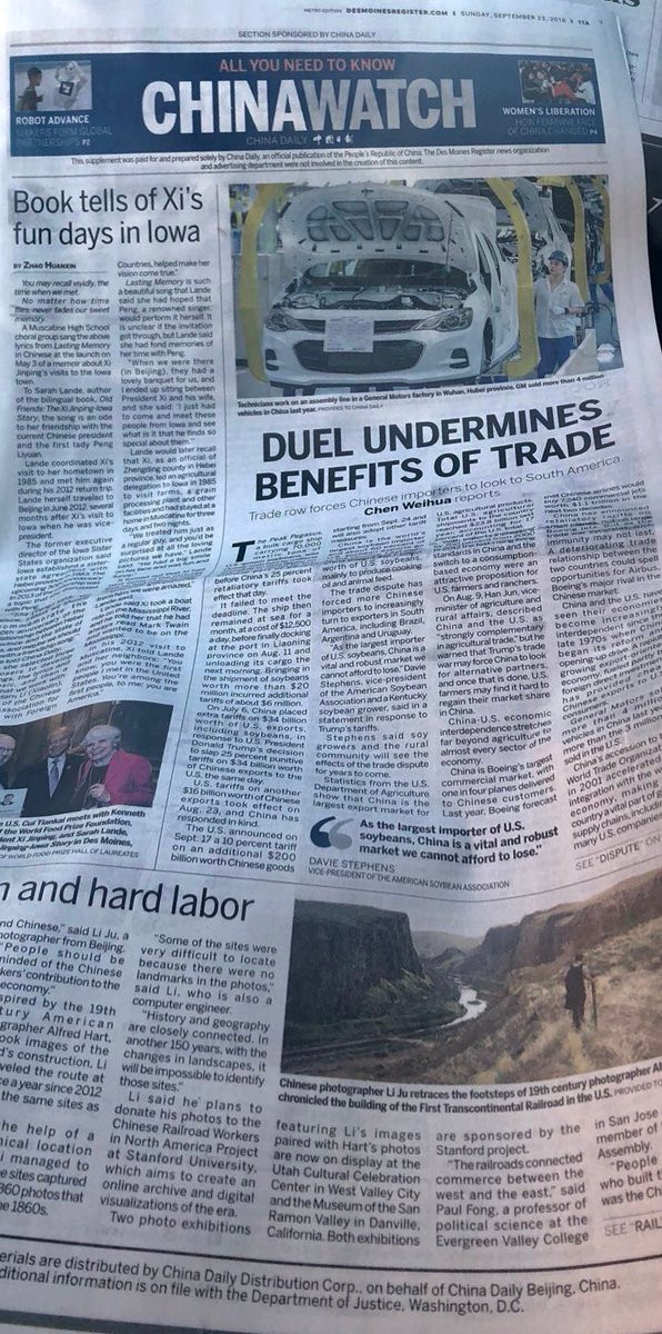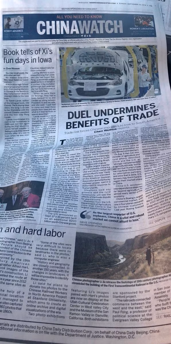 "Trung Quốc đang thực sự tiến hành quảng cáo trên trang Đăng ký Des Moines và các ấn phẩm truyền thông khác, nội dung giống như một tin tức", ông Trump viết (tweet) trên tài khoản của mình. "Nguyên nhân vì chúng tôi đang đánh bại họ trong lĩnh vực thương mại, mở cửa thị trường, những người nông dân sẽ tăng nguồn thu nhập khi những chính sách kinh tế chống Trung Quốc kết thúc!"