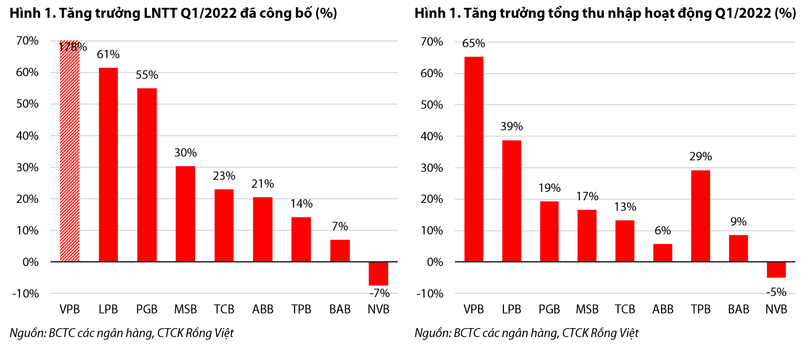 Với khoảng 9 ngân hàng công bố báo cáo tài chính tại thời điểm thu thập dữ liệu, VDSC ước tính tăng trưởng tổng thu nhập lãi thuần bình quân của nhóm này là 21%, tổng thu nhập hoạt động tăng trưởng 36% và tăng trưởng lợi nhuận trước thuế đạt 70%. Trong đó, VPBank công bố lợi nhuận tăng trưởng bất thường nhờ khoản phí trả trước bancassurance.