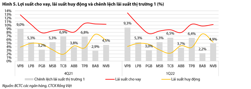 Theo đó, lãi suất huy động trong quý 1/2022 tăng trung bình 3 điểm cơ bản so với quý IV/2021. Lợi suất cho vay bình quân giảm 8 điểm cơ bản. Điều này dẫn đến việc thu hẹp chênh lệch lãi suất thị trường 1 của nhiều ngân hàng.