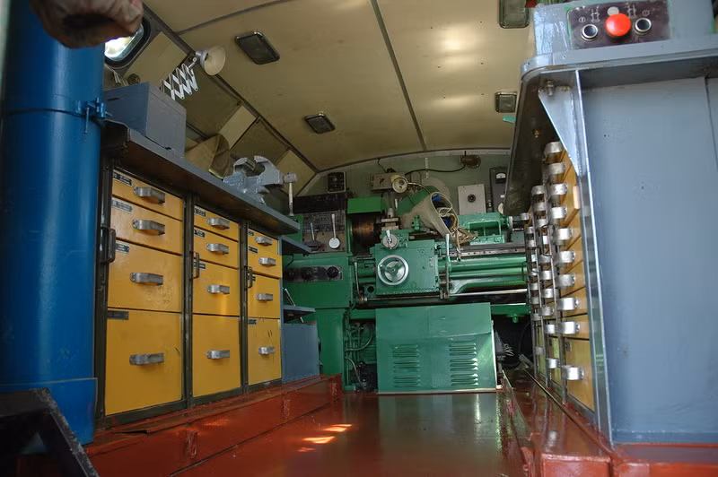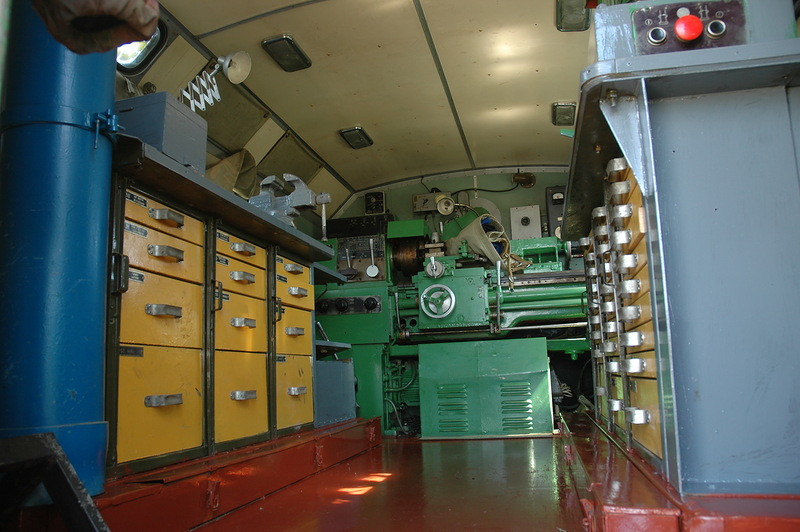 Bên trong xe công trình gia công cơ khí. Máy tiện cũng tương đối giống với những dòng máy tiện ở các đại đội kỹ thuật thời kỳ những năm 90x.