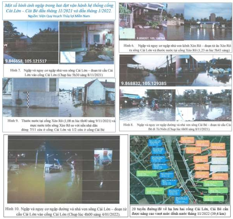 + Trên địa bàn của công trình, ở xã Bình An Huyện Châu Thành (Kiên Giang) cũng đã chịu cảnh ngập vào mùa mưa 2022 trong đợt triều cường tháng 7. Vụ việc đã xảy ra sau thời điểm công văn trả lời và sau lễ khánh thành, nhưng không thể không đề cập vì không xa lạ với hai cống Cái Lớn, Cái Bé. Hình ảnh ngập đường, nhà dân ruộng vườn có thể thấy trong phóng sự của Đài PTTH Kiên Giang ngày 12/07/2022.