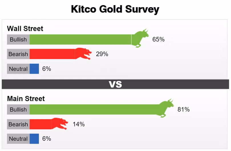Theo đó, trong số 1.051 nhà đầu tư tham gia khảo sát, có tới 848 người (chiếm 81%) nhận định giá vàng tuần tới tăng; 142 người (14%) dự đoán giá giảm và 61 người (6%) cho rằng giá đi ngang hoặc có ý kiến trung lập.