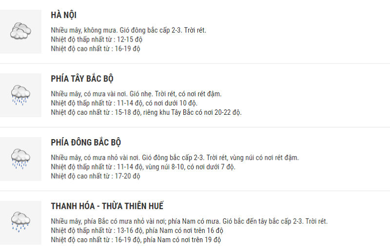 Riêng khu vực Hà Nội, ngày 30/1 trời nhiều mây, không mưa, gió đông bắc cấp 2-3, trời rét. Nhiệt độ dao động từ 12 đến 19 độ C.