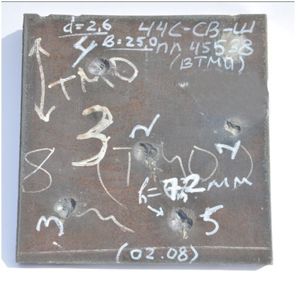 Đây là một mẫu thép 44S-sv-Sh có độ dày 25mm sau lần thử nghiệm bằng đạn xuyên giáp B32 12,7mm. OJSC"NII Steel"
