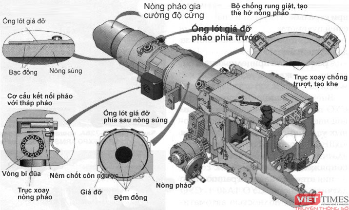 Ổ bi trục kết nối giá pháo với tháp pháo là ổ bi đũa hình côn có chốt hãm quay ngược vào bên trong. Trục giá đỡ pháo gắn liền với ốp lót nòng pháo, phần họng ốp lót giá đỡ nòng pháo được kéo dài thêm 160 mm. Trên phần họng của ốp lót giá đỡ nòng pháo được gia cố thêm 2 bộ phận hãm định vị nòng pháo, cả 2 bộ ốp lót nòng pháo được chế tạo hình lăng trụ. Những giải pháp kỹ thuật đã nêu khiến nòng pháo giảm rung giật ngang đến mức tối thiểu, từ đó triệt tiêu độ tản mát đến 15% theo các bảng bắn truyền thống.
