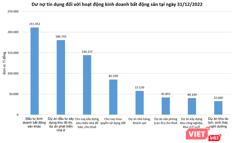 Cụ thể, trích dẫn số liệu của Ngân hàng Nhà nước Việt Nam (NHNN), báo cáo nhà ở và thị trường bất động sản quý IV năm 2022 và cả năm 2022 của Bộ Xây dựng cho biết, tính đến ngày 31/12/2022, dư nợ tín dụng đối với hoạt động kinh doanh bất động sản đạt khoảng 800.000 tỉ đồng.