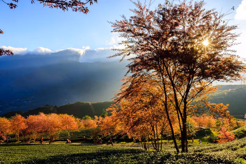 Thời điểm chụp ả Thời điểm chụp ảnh đẹp nhất đồi chè là khi sáng sớm, lúc mây còn bảng lảng chưa tan nhưng ánh nắng đã le lói đổ bóng qua những hàng cây. Hoa đào và hoa nắng lấp lánh xen kẽ, tạo nên khung cảnh đẹp mê hồn mà ai cũng sẽ một lần ao ước muốn được đặt chân tới.