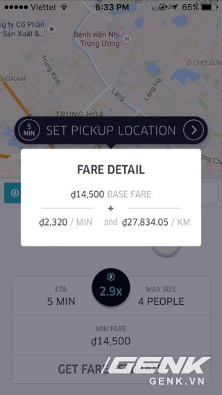 Surge Pricing đề xuất của Uber tại khu vực Trung Hòa, Hà Nội là 2.9x. Người dùng sẽ mất tới 14.500 đồng mở cửa trong khi xe chưa chạy được km nào.