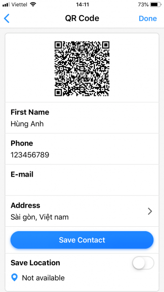 Nội dung mã tức khắc hiện ra, bạn có thể sao chép với nội dung là văn bản hay email/SMS, mở đường link ngay trong ứng dụng với nội dung là URL, hay lưu vào danh bạ với nội dung là VCard. Ở bên dưới mỗi mã quét đều có tùy chọn Save Location cho phép lưu lại trí bạn thực hiện quét.