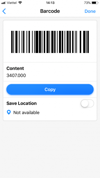 Xem xong, bạn bấm Done > Save để lưu lại mã đã quét và xem lại khi cần sau này. Không muốn lưu thì bấm Don’t Save. Mã lưu sẽ hiển thị trên giao diện chính và nếu là mã vạch thì nằm trong giao diện Barcodes (bấm biểu tượng Barcode ở hàng bên dưới để truy cập).