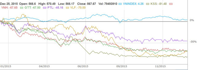 Chốt phiên cuối năm 2015, KSS lấy đi của nhà đầu tư 81.48% tài sản, VNH là 67.65% , GTT là 67.50%, PTL là 45.16% và VLF là 70%. Những cổ phiếu này đều có thị giá nhỏ và mang tính đầu cơ cao, những nhà đầu cơ theo trường phái “lướt sóng” trên thị trường nếu chọn nhầm những cổ phiếu này thì sẽ có một năm thua lỗ đáng kể.
