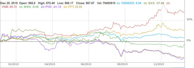 VNM và FPT có mức tăng trưởng cao hơn so với Vnindex, so với đầu năm, VNM tăng 69.70%, FPT tăng 26.96%. Nếu nhà đầu tư chỉ mua và nắm giữ 2 cổ phiếu này từ đầu năm thì hiện tại thu được mức lợi tức khá hấp dẫn. Mặt khác, 3 cổ phiếu còn lại giảm mạnh, GAS giảm 37.48%, MSN giảm -5.06%, PVD giảm -41.13%.