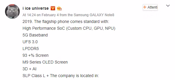 Ice Universe dự đoán Galaxy S10 sẽ được nâng cấp bộ nhớ RAM khủng theo chuẩn LPDDR5. Samsung đem đến cho mẫu điện thoại này một công nghệ màn hình OLED hoàn toàn mới mang tên M9 với tỷ lệ màn hình chiếm tới 93% toàn máy. Ngoài ra, chip xử lý AI (Neural Proccessing Unit) giúp Galaxy S10 trở thành một chiếc điện thoại thông minh đúng nghĩa. Không có chỉ vậy, chip xử lý AI mới trên Galaxy S10 hứa hẹn sẽ giúp cải tiến khả năng chụp ảnh và quay phim (tương tự như Google với bộ đôi Pixel 2). Với sự hỗ trợ của chip xử lý AI, chất lượng hình ảnh và video sẽ vô cùng sắc nét và trung thực.