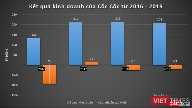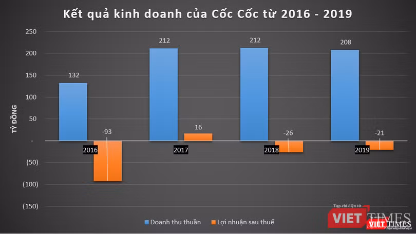 Dữ liệu của VietTimes cho thấy, trong giai đoạn từ 2016 – 2019, dù vẫn ghi nhận doanh thu hàng trăm tỷ đồng mỗi năm, Cốc Cốc chỉ báo lãi duy nhất một lần vào năm 2017.