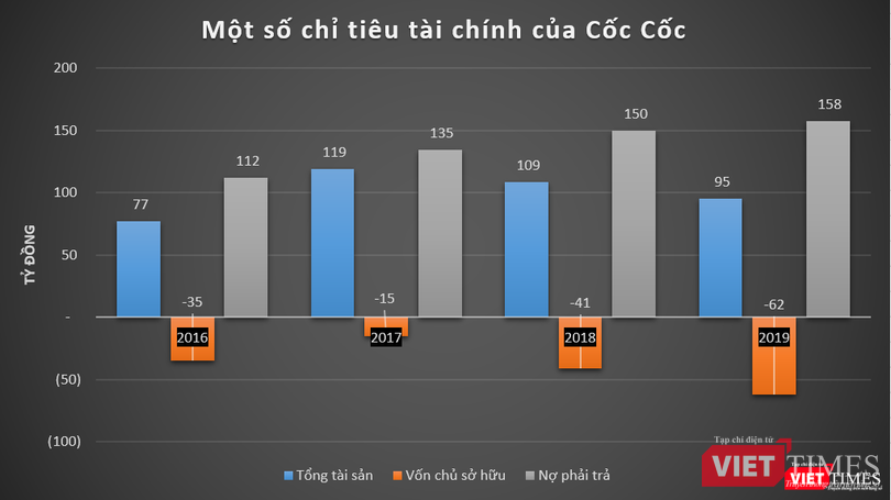 Tính đến cuối năm 2019, tổng tài sản của Cốc Cốc đạt 95,45 tỷ đồng, giảm 12% so với thời điểm đầu năm; vốn chủ sở hữu giảm thêm 21 tỷ đồng về mức âm 62,2 tỷ đồng.