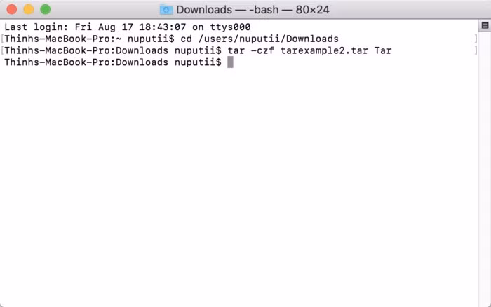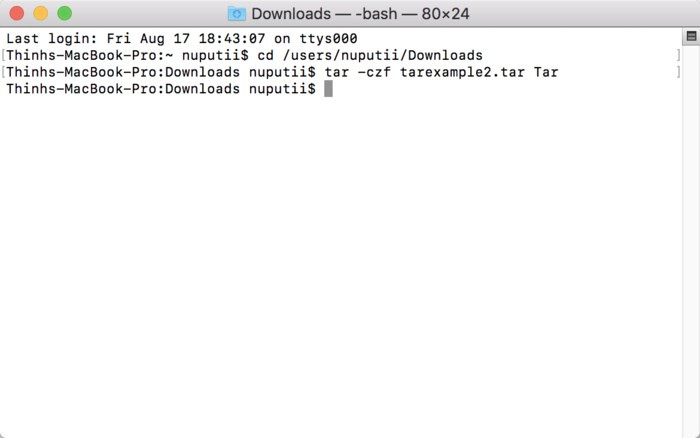 Ví dụ trong ảnh trên, các file cần tạo được lưu trong thư mục Tar, thư mục mẹ của Tar là Downloads. Đầu tiên di chuyển đến thư mục Downloads, sau đó nhập lệnh để tạo file mang tên tarexample2.tar từ thư mục Tar tạo sẵn.